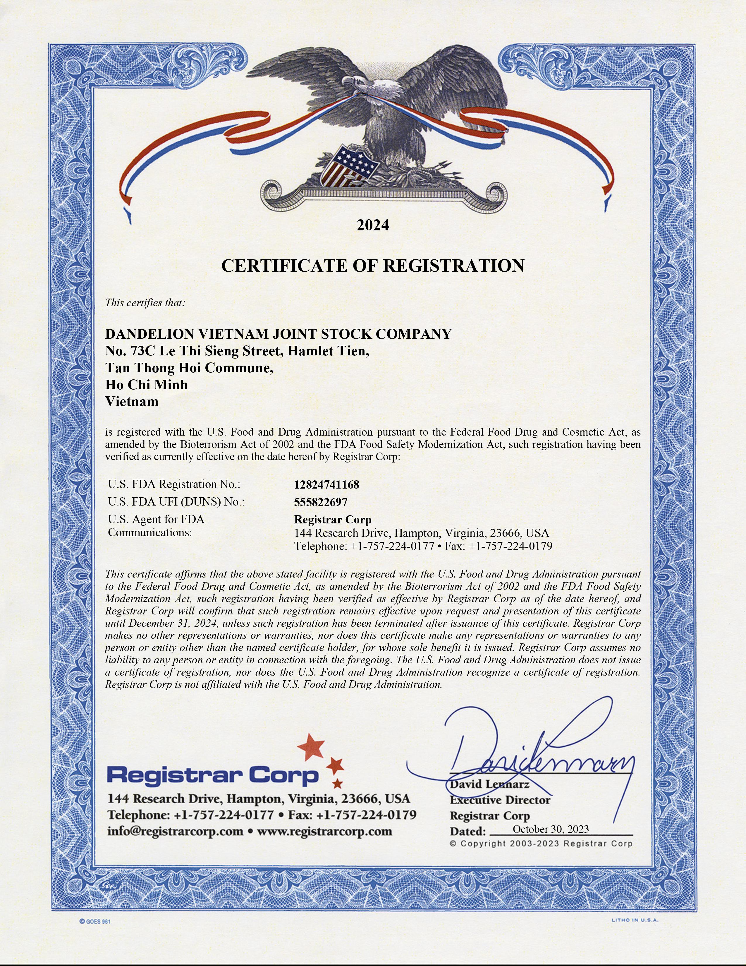 Giấy Chứng Nhận Đăng Ký FDA | Dandelion Vietnam Joint Stock Company
