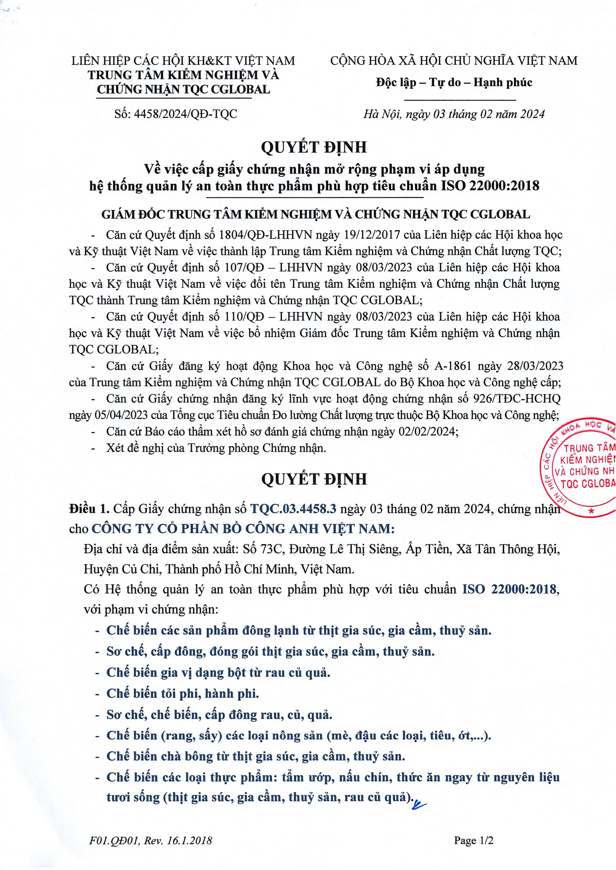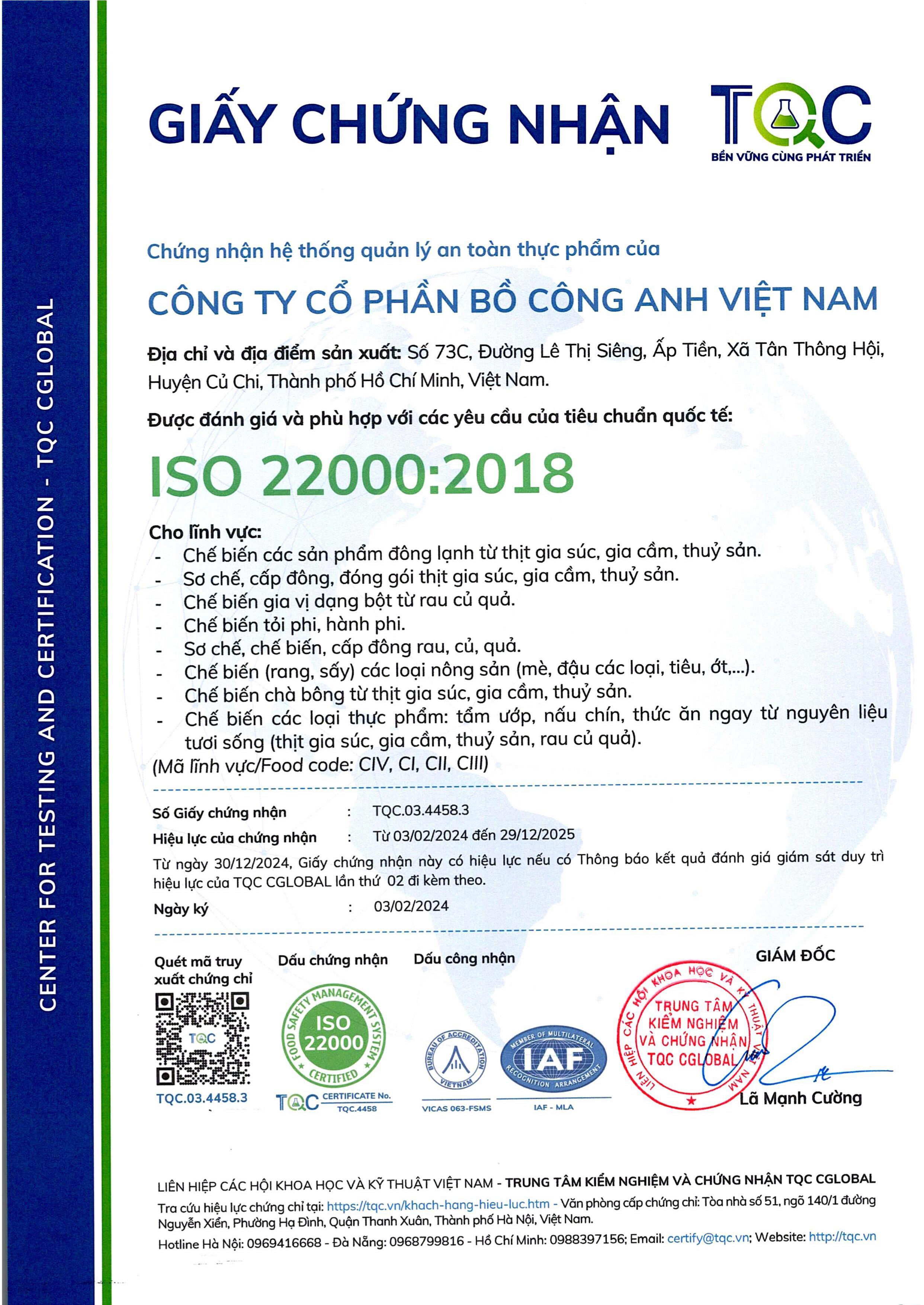 Giấy chứng nhận ISO 22000:2018 - Công Ty Cổ Phần Bồ Công Anh Việt Nam