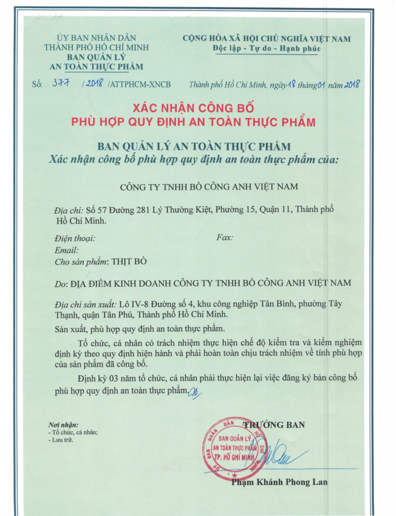 Xác Nhận Công Bố Sản Phẩm Thịt Bò Phù Hợp Quy Định ATTP