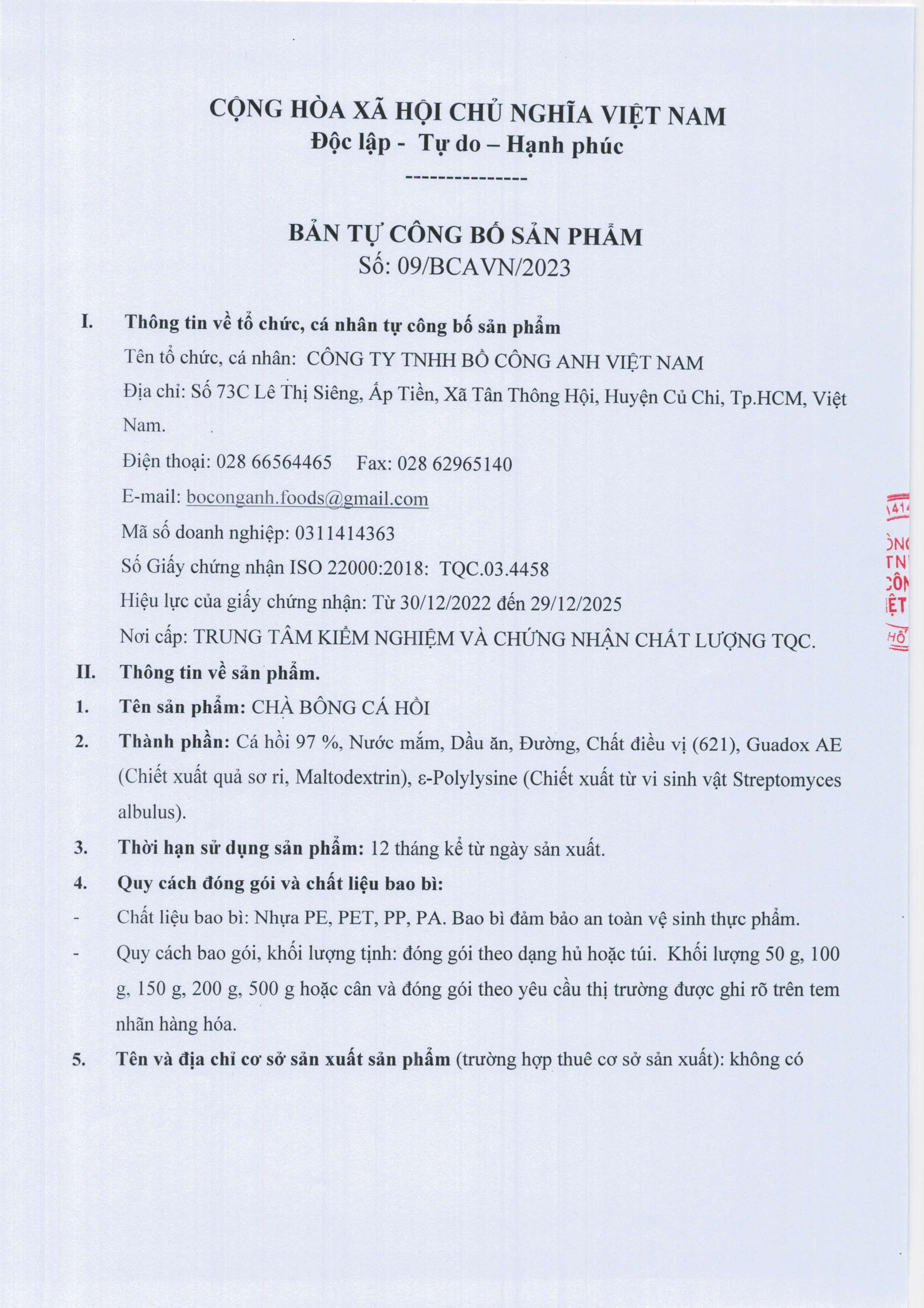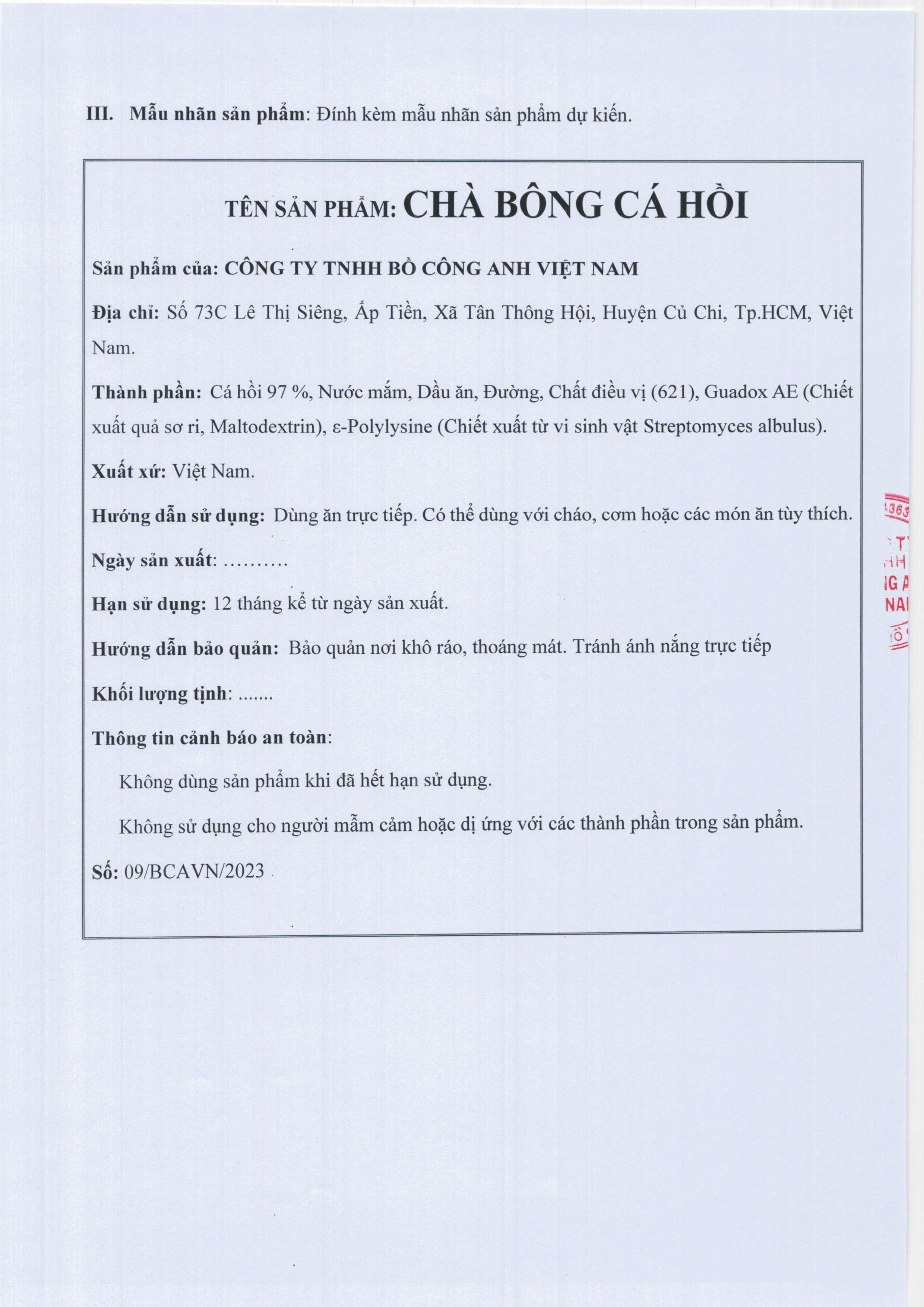 Hồ sơ tự công bố sản phẩm chà bông cá hồi | Bồ Công Anh Foods