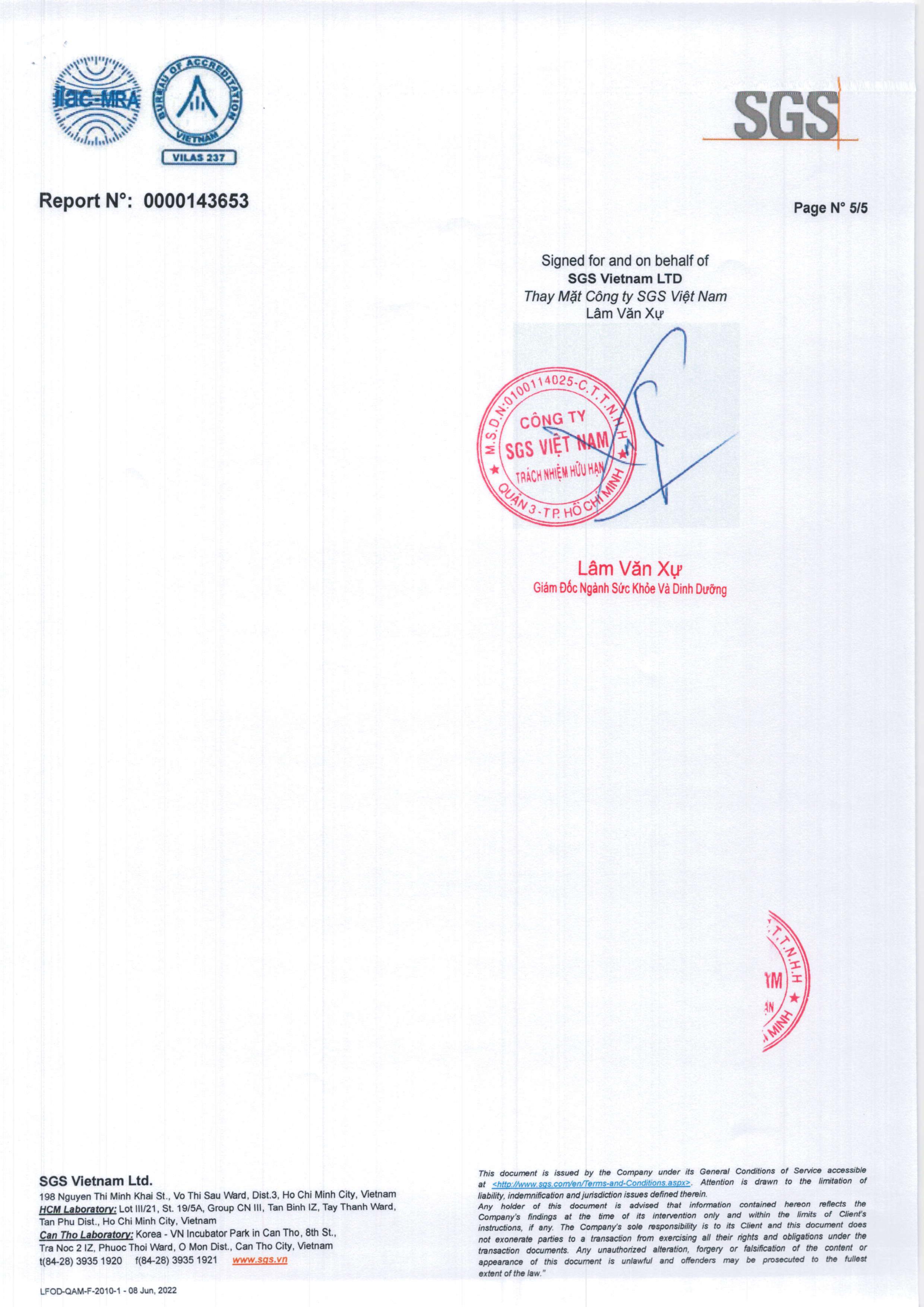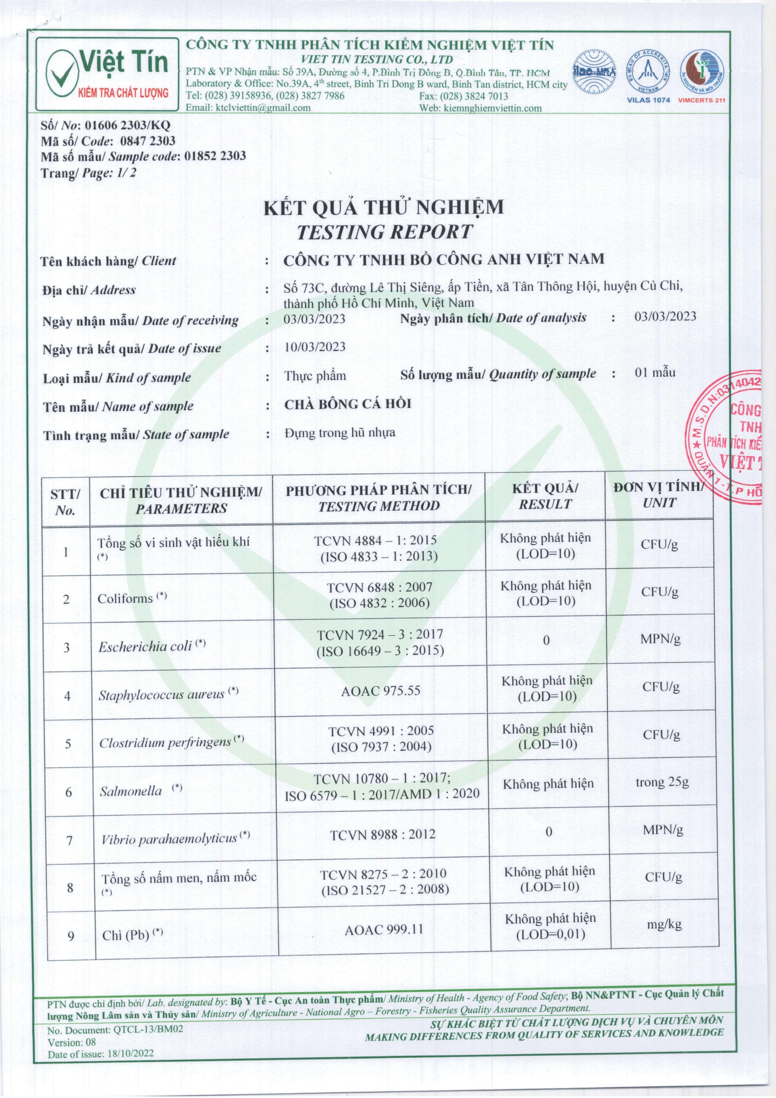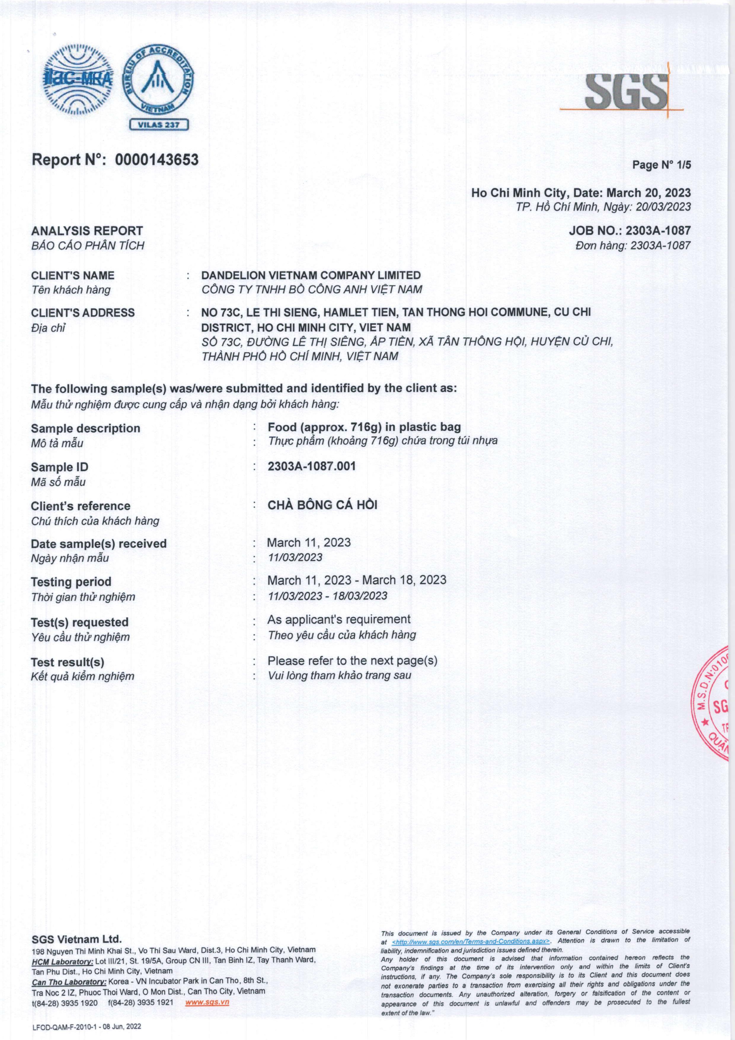Hồ sơ tự công bố sản phẩm chà bông cá hồi. Sản phẩm chà bông cá hồi được thử nghiệm và đánh giá bởi Tập đoàn SGS chuyên thử nghiệm, giám định và chứng nhận hàng đầu thế giới.