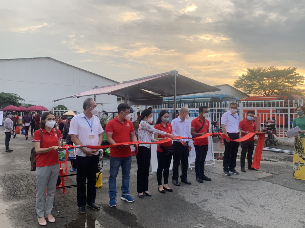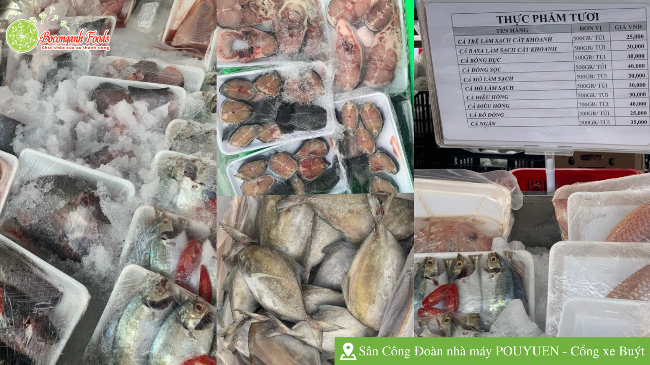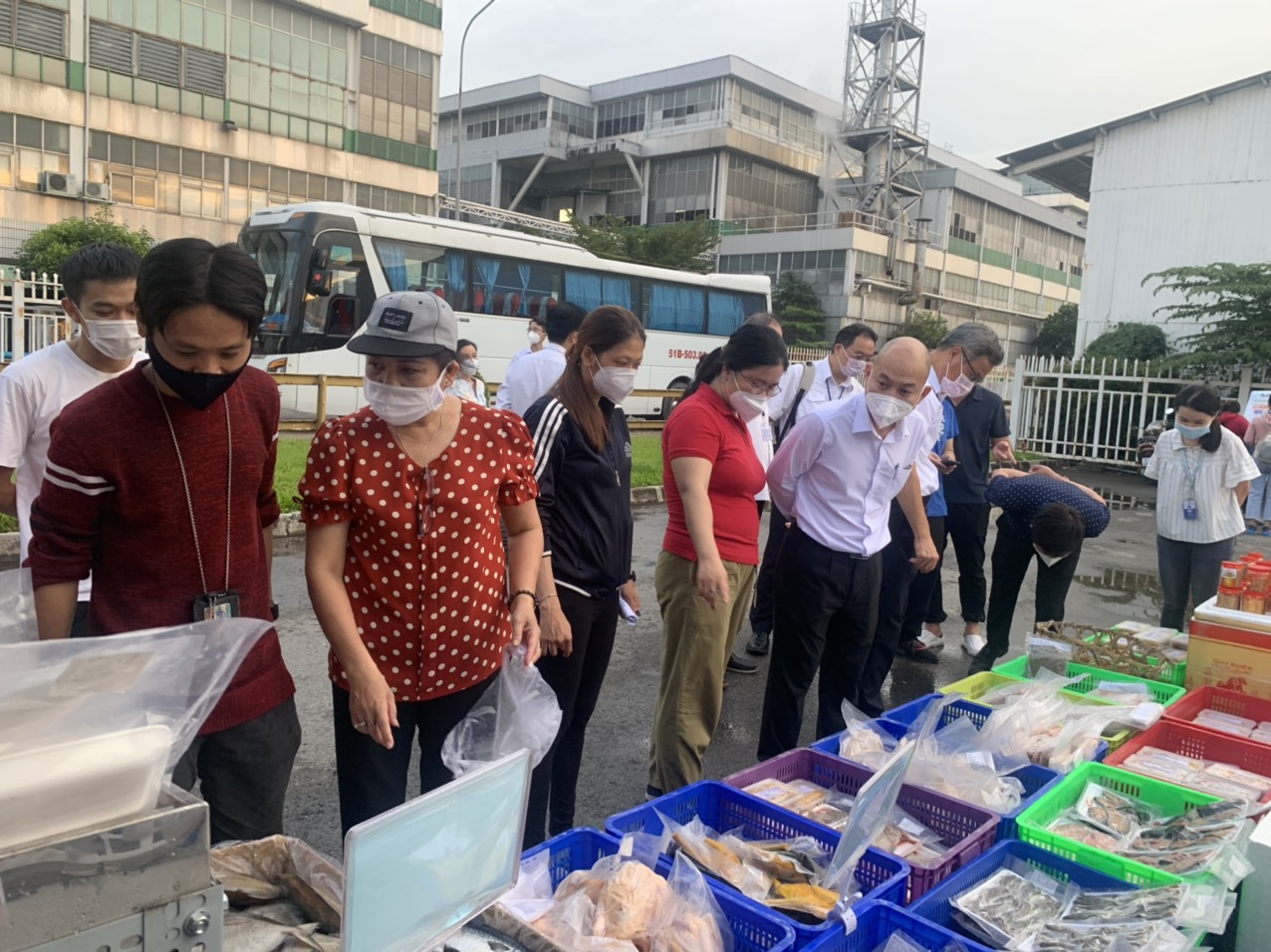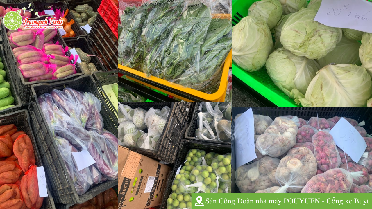 Gian hàng được bày bán tại sân Công Đoàn nhà máy - Cổng xe buýt với rất nhiều mặt hàng phong phú từ thịt cá, rau củ quả cho đến gạo, trứng, gia vị nấu ăn... với giá cả bình ổn, đảm bảo chất lượng cho cán bộ công nhân viên tại nhà máy.