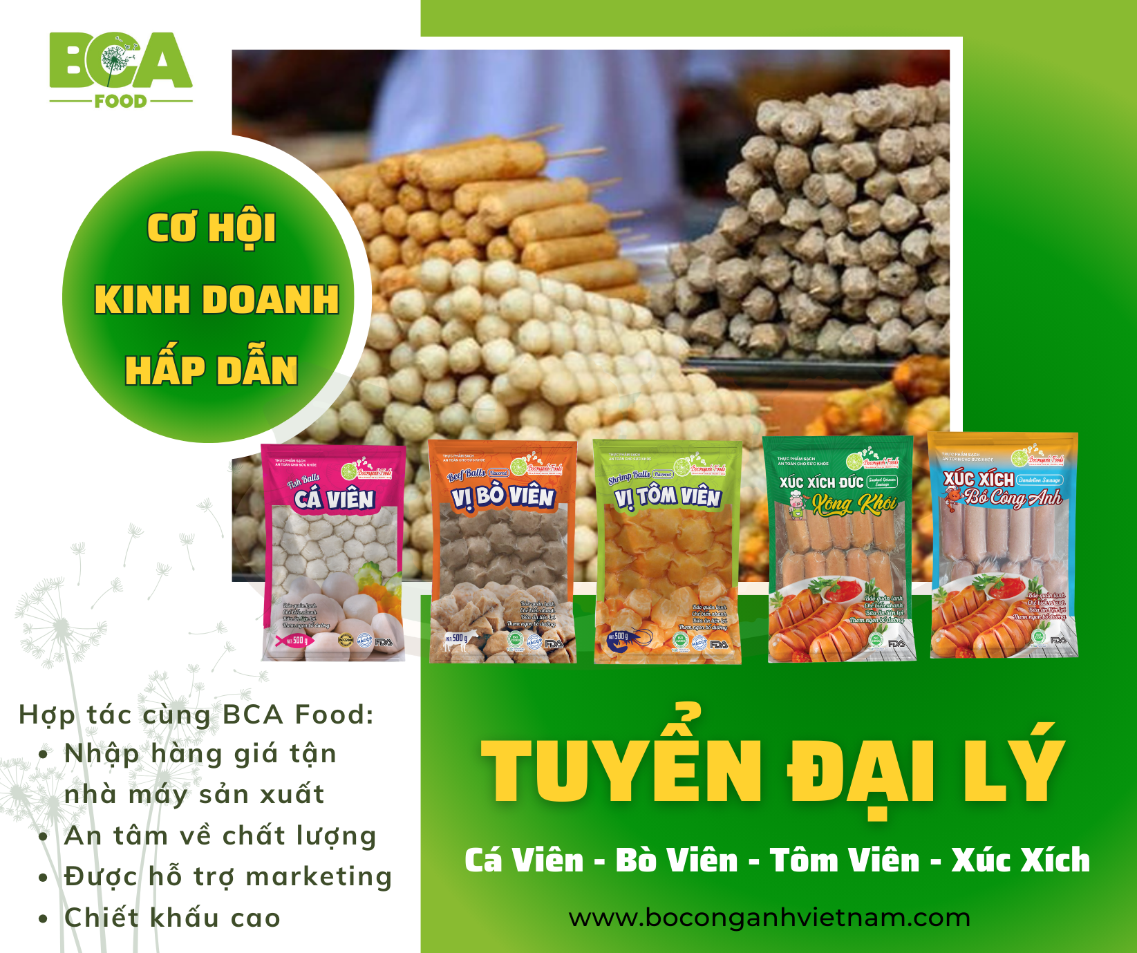 Bồ Công Anh Food trân trọng giới thiệu đến Quý Đối Tác sản phẩm cá viên chiên, đã và đang nhận được sự yêu thích rộng rãi từ người tiêu dùng. Nhằm mở rộng mạng lưới phân phối và mang đến cho nhiều người tiêu dùng hơn nữa những sản phẩm ngon miệng và tiện lợi, chúng tôi chân thành mời Quý Đối Tác trở thành đại lý của Bồ Công Anh Food.
