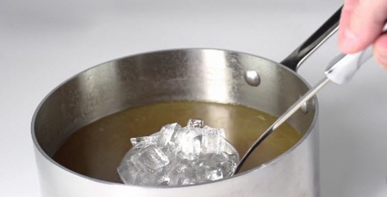 Bạn hãy để một ít viên đá lên vá múc canh kim loại và lướt trên bề mặt canh. Chất lạnh từ vá đựng đá sẽ làm dầu mỡ bám dính vào đáy vá múc canh, việc lấy dầu mỡ ra khỏi canh vô cùng dễ dàng.
