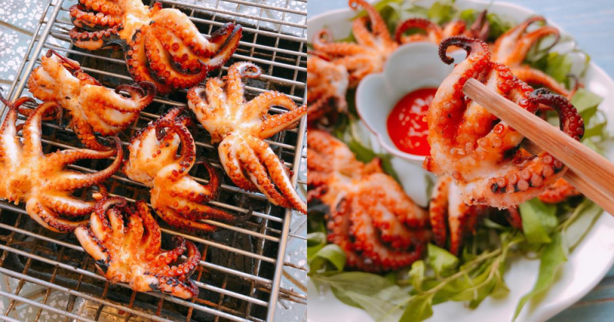 Những miếng bạch tuộc khi chín có mùi thơm hấp dẫn, được ăn cùng các loại rau sống, chuối xanh và chấm muối ớt thì vô cùng tuyệt vời.