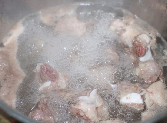 Xương heo: Rửa sạch xương sau đó chặt thành các miếng vừa ăn. Tiếp đến, bạn đun một nồi nước sôi sau đó cho xương vào chần qua cho hết bọt bẩn. Cuối cùng, bạn đem rửa lại xương một lần nữa rồi cho vào ninh trong khoảng 30 phút.