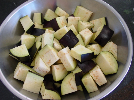 Cà tím: Rửa sạch cà tím rồi xắt thành những miếng vuông vừa ăn. Tiếp đến, bạn cho cà tím vào xào khoảng 5 phút với sả phi thơm. Nêm chút gia vị cho cà tím đậm đà.